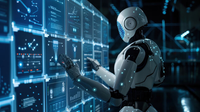 Young man interacting with holographic data panels and digital dashboards in futuristic lab