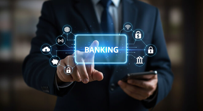 Businessman's Finger Touching a Glowing Digital Bank Icon on a Virtual Interface.