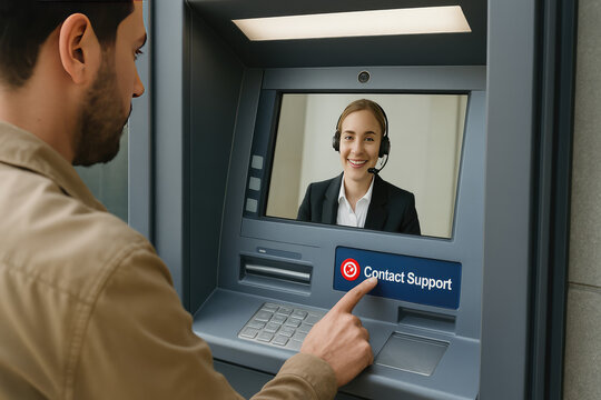 ATM Support: A man interacts with an ATM machine, with a support staff member on screen, symbolizing modern banking and customer service.