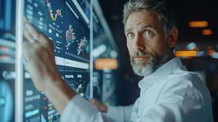 Caucasian man with beard interacting with futuristic touchscreen interface, wearing white shirt, focused expression. Copy space.