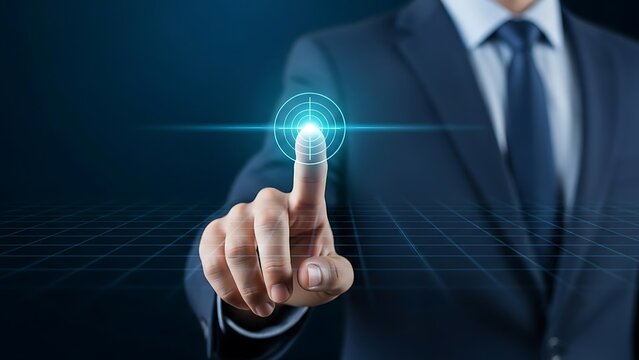 Businessman interacting with virtual interface and touching finger to the screen