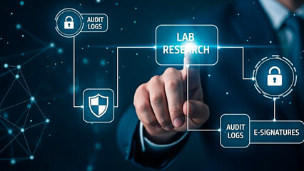 A man in a blue shirt interacting with a digital fingerprint interface for secure authentication and data access