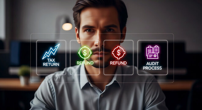 Businessman in blue suit interacting with virtual interface at desk with laptop