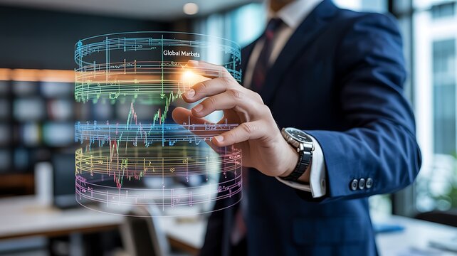 A man in a suit interacts with a futuristic transparent display showing data and graphs in an office ai generated