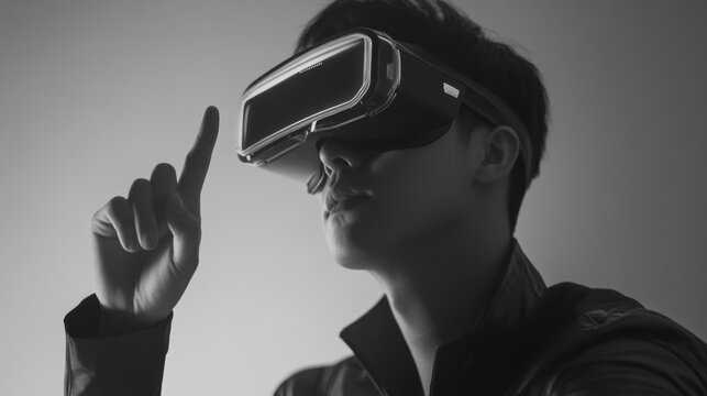 Man wearing virtual reality goggles interacting with a virtual interface against a minimalist grey background showcasing modern technology concepts