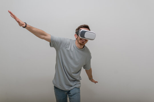 Futuristic man wearing virtual reality glasses interacts with the air in an isolated gray background.