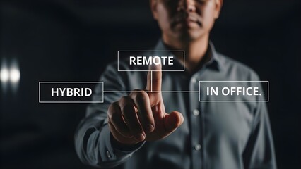 Businessman in a gray shirt interacting with virtual office mode options on a dark background with a shallow focus.