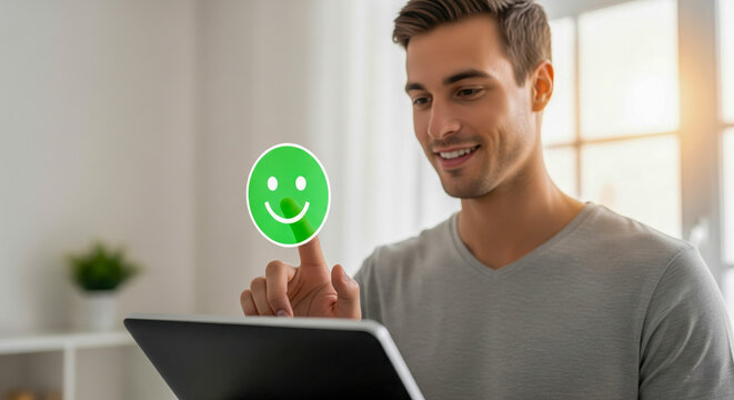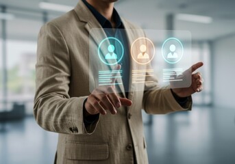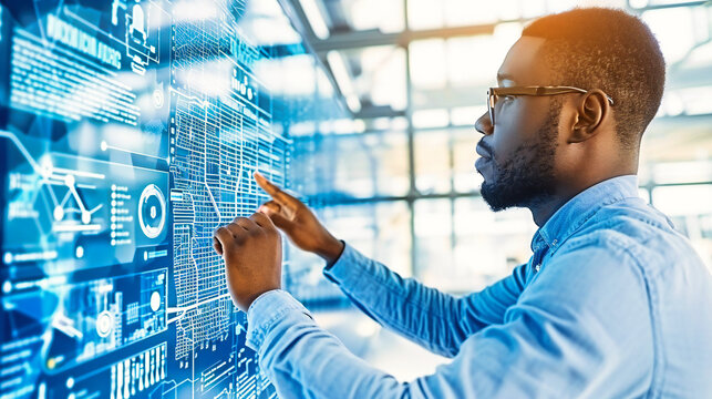 A young man experiences virtual reality, interacting with digital elements in a modern indoor setting, showcasing futuristic technology.