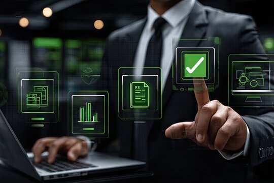 A man in a suit interacts with a digital interface showing checklists, selecting one with a green checkmark, holding a tablet.