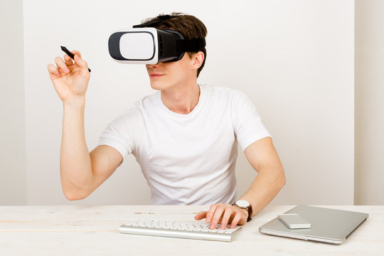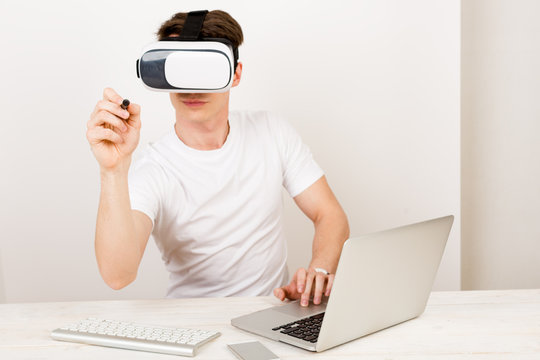 Male using virtual reality headset interacts with augmented things orienting in three dimensional space while sitting on his desk with keyboard and laptop on white background.