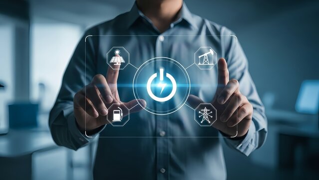 Businessman Interacting with Virtual Screen Featuring Color Icons