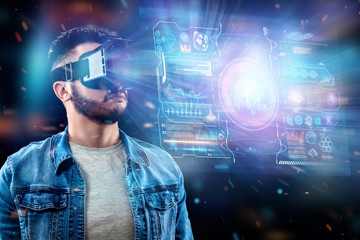 Portrait of a man with glasses of virtual reality, vr, interacts with a virtual screen. The concept of the future is here, applications complement reality, the interface of virtual reality