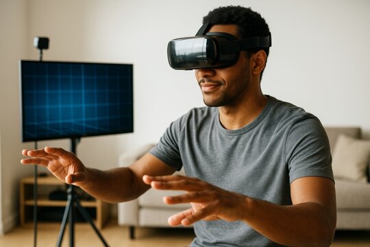 Man immersed in virtual reality at home with vr headset