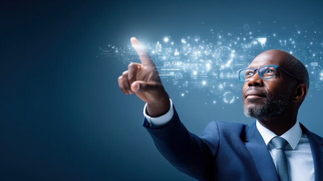 A confident businessman interacts with a futuristic digital interface, highlighting innovation and modern technology on transparent backdrop.