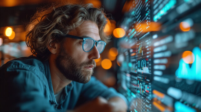 A man interacts with a futuristic digital interface displaying data and analytics.