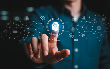 Man interacting with digital interface displaying brain, data, and document icons in a modern office