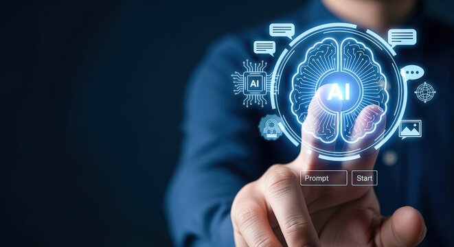 Man interacting with a glowing blue AI interface projected from his fingertip, symbolizing artificial intelligence and future technology.