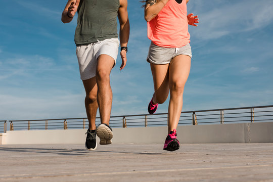 Sports lifestyle. Jogging outdoors. Man running on the sea pier. Motion blur.
