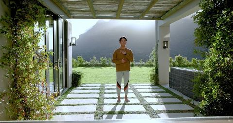Asian man embracing nature with morning stretch in tranquil scenic bedroom