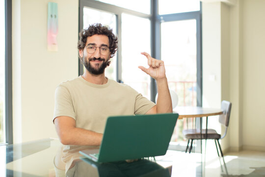 Caucasian handsome man isolated on beige background holding copyspace imaginary on the palm to insert an ad and with thumbs up
