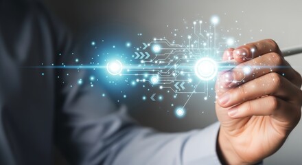 Digital Transformation Concept: Person Interacting with Futuristic Interface for Data Analysis and Technological Advancement