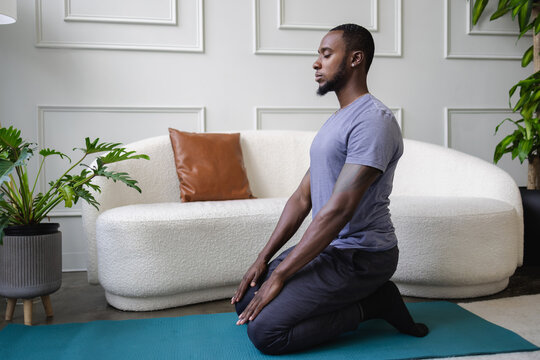 African american man meditating in minimalist home, sitting cross-legged facing window