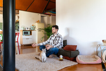 A young guy is sitting on couch meditating and stretching while listening to music and using his mobile phone in his house during the day