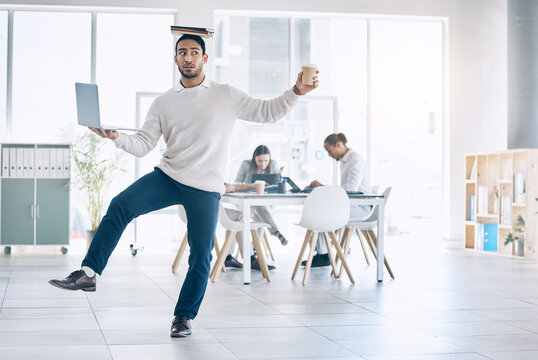 Balance, multitask and busy with a business man carrying a laptop, book and coffee in the boardroom. Assistant, overworked and one leg with a male employee multitasking during a meeting in the office