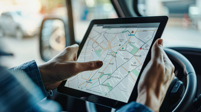 A person is using a tablet to navigate a map while driving. The tablet is placed on the steering wheel, and the person is using their finger to point at a location on the map