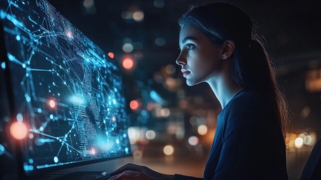 Digital technology, internet network connection, big data, digital marketing IoT internet of things. Woman using modern computer surfing internet futuristic metaverse, innovative technology background