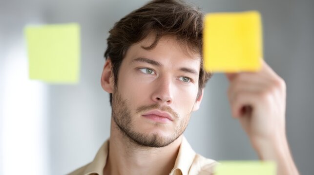 A focused young man examining colorful sticky notes on a wall, brainstorming and organizing thoughts in a modern workspace, representing creativity and productivity in the workplac