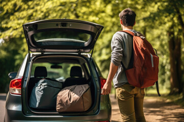 College, university student moving at dorm, new home, relocation. Back to school car with many luggage, bags
