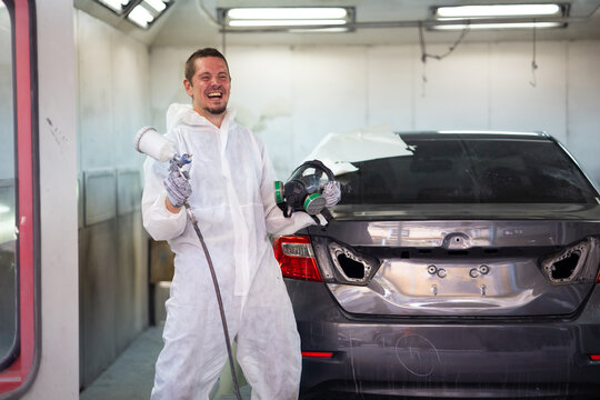 Portrait of a latin young worker removing a respiratory protection mask, as he finishes a spray painting job in his workshop. Health protection in industrial work. Real people working.