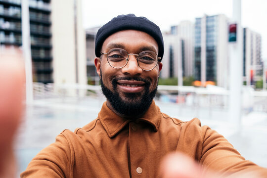Portrait of happy smiling young african american man taking selfie with phone on city street