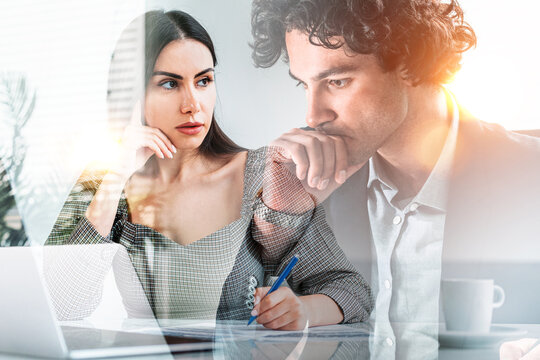 Businesswoman wearing formal suit and businessman work together