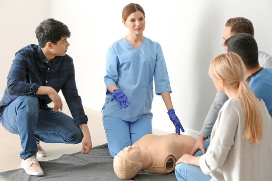 Group of people with instructor practicing CPR on mannequin at first aid class indoors