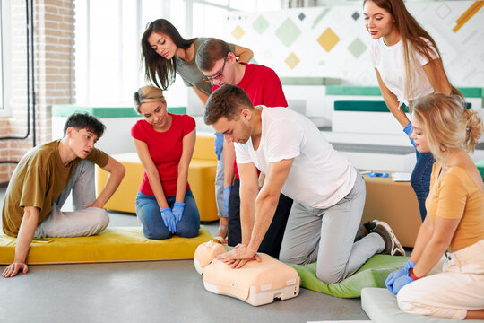 young male practicing CPR first aid on a mannequin in the presence of people, indoors