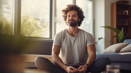 Relaxed man practicing mindfulness meditation at home with a serene expression