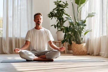 Relaxed senior man practicing yoga on mat, focusing on mindfulness and well being. serene environment enhances calming atmosphere, promoting peace and tranquility