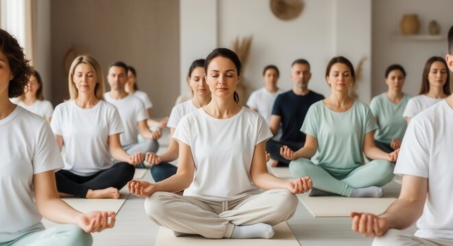 Group of people meditating in a bright yoga studio. Diverse men and women sitting in lotus position with eyes closed. Mindfulness and wellness concept