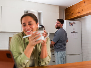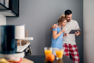 Satisfied smiling attractive man showing internet content to his beautiful curious girlfriend on a tablet while she drinking a coffee and standing in the kitchen in pajamas.