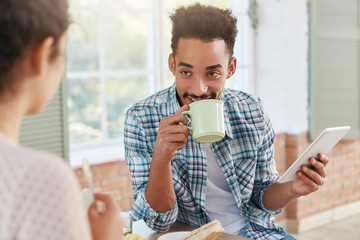 Pleased stylish man has beard and mustache, smiles happily, shares his success at work to wife who prepares supper. Attractive dark skinned male with broad smile reads news on website uses internet