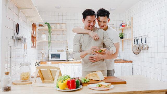 Asia gay couple using tablet and preparing the breakfast, sandwich vegetable on table in kitchen at home. Young LGBT men talking happy relax rest together spend romantic time at house in morning.