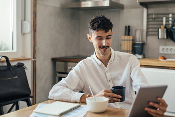 morning routine, young businessman drinking morning coffee and check mail on digital tablet in kitchen