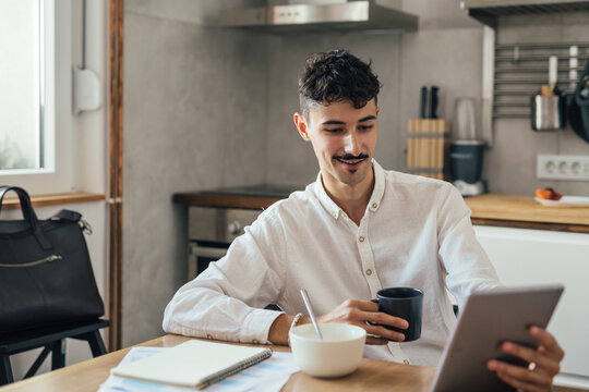 Man Preparing Coffee While Using Tablet In Modern Kitchen Images