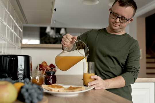 Adult caucasian man with down syndrome preparing breakfast