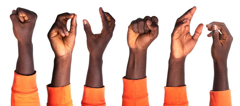 Set of black Hand in orange sweater gestures isolated on transparent background