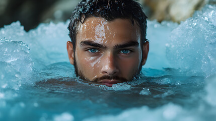 Resilient man ice bath, invigorating cold water immersion, determined plunge anti inflammatory immunity fitness, energetic healthy therapy, wellness strength vitality.