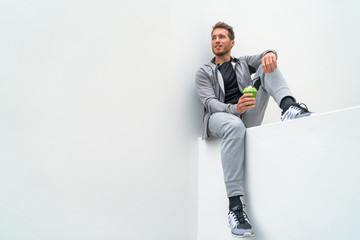 Man listening to music mobile phone app wearing headphones sitting at home. Healthy lifestyle sport athlete using smartphone on jogging break outdoor.