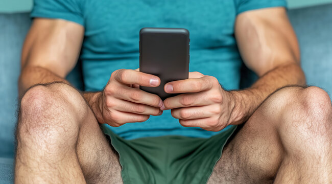 Man Relaxing On Couch Engaged With Smartphone At Home Images